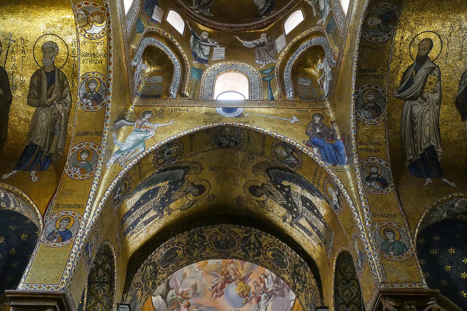 I mosaici sono i più bei prodotti dell’arte bizantina, senza eguali in alcuna delle chiese di Costantinopoli. Si distinguono fra gli altri il Cristo Pantocratore della cupola, gli angeli che lo circondano e gli Evangelisti assorti nei loro studi, che sono i mosaici più antichi. La tradizione islamica è infine rappresentata dal soffitto ligneo a muqarnas (stalattiti), la più imprevedibile copertura per una chiesa cristiana. Si tratta infatti del classico soffitto che ci aspetteremmo di trovare nelle moschee più grandi ed eleganti, ma mai in una chiesa. Intricate decorazioni ornano le stalattiti e, caso più unico che raro nella storia dell’arte islamica, si tratta di decorazioni comprendenti figure umane. Gli artisti arabi infatti, nell’atmosfera tollerante della Palermo normanna, si convinsero ad azzardare questo tipo di figurazioni e così, con l’aiuto di un binocolo, possiamo distinguere oggi realistiche scene di vita quotidiana di dignitari ed ancelle affaccendate.