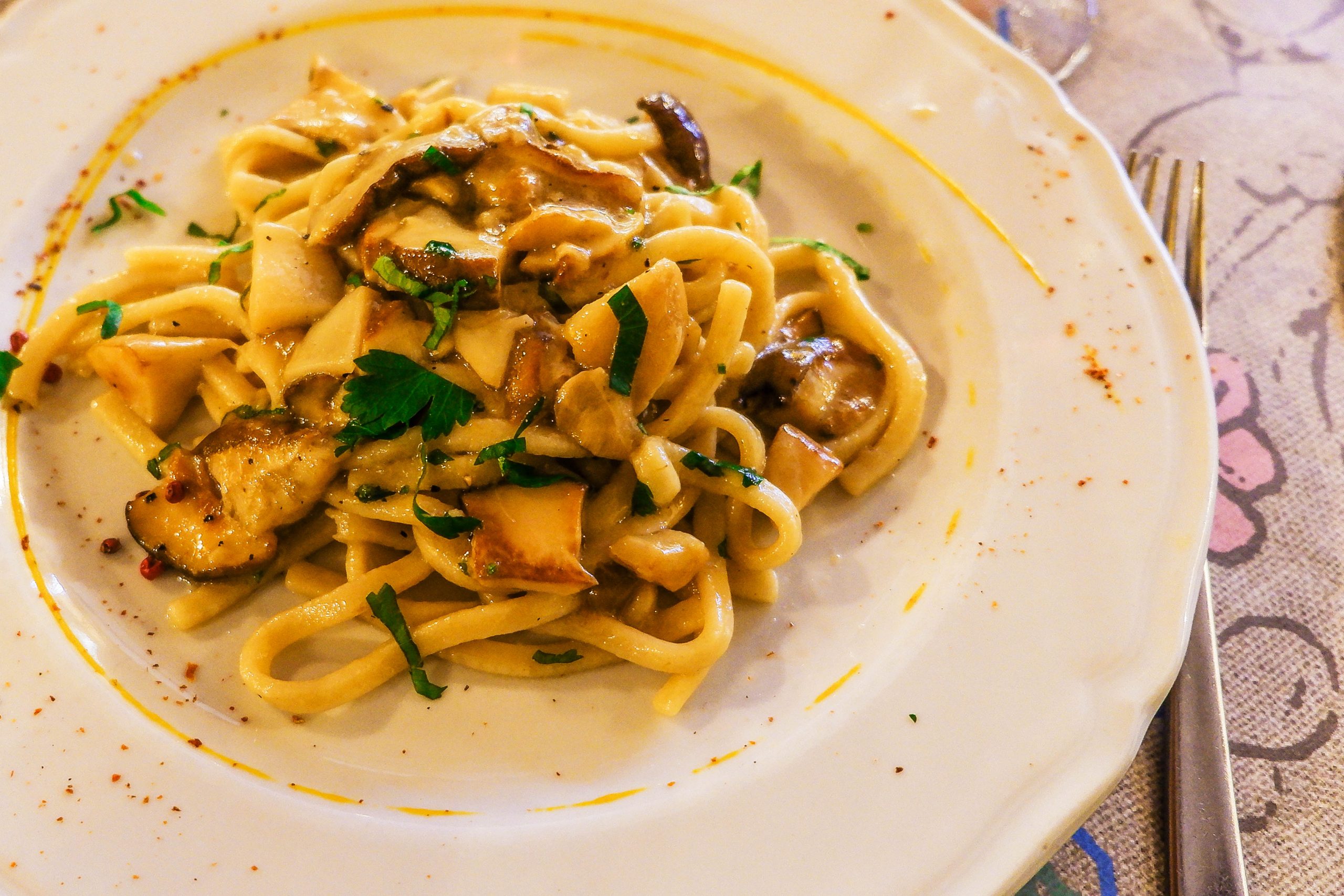 TALLARINES CON SETAS PORCINI. Calienta el aceite (o la mantequilla) y un diente de ajo en una sartén. Limpia los champiñones, córtalos en rodajas y ponlos en la sartén. Fríe durante unos 10 minutos. Si quiere, también puede cocer algunos tomates en la salsa (los tomates cherry serían perfectos). Sal, pimienta y perejil. Mientras tanto, cuece los tallarines en una olla, escúrrelos y pásalos por la sartén con la salsa.