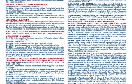 Le celebrazioni agatine poi si svolgeranno secondo le tradizionali consuetudini dal 16 agosto con l’esposizione del Velo di Sant’Agata nella Basilica Cattedrale di Catania per l’intera giornata, la Messa e la processione serale.