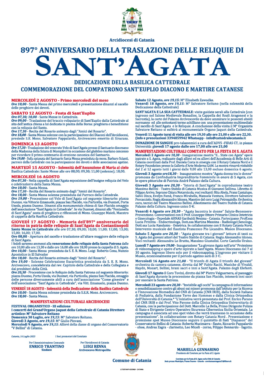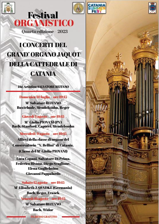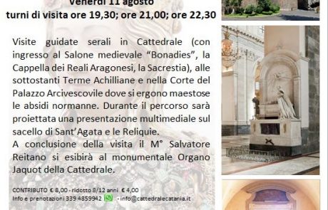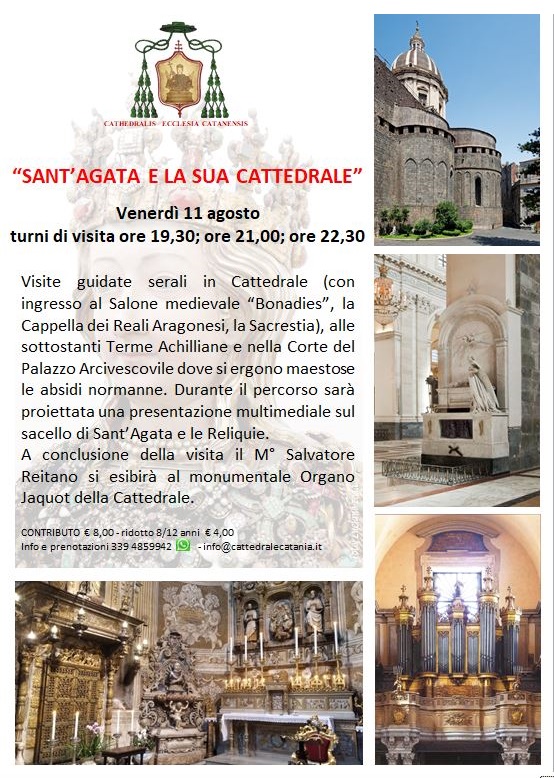 La celebrazione della Dedicazione della Cattedrale sarà invece preparata da due eventi culturali volti ad evidenziare il prezioso patrimonio in essa contenuto: la III edizione del festival organistico “I concerti del Grand’Organo Jaquot”, con la direzione artistica del M° Salvatore Reitano (con esibizioni il 30 luglio ed il 3, 9, 12, 18 agosto) e le visite guidate “Sant’Agata e la Sua Cattedrale” che permetteranno di accedere in luoghi meravigliosi non sempre fruibili (venerdì 11 agosto con turni di visita alle ore 19:30, alle ore 21 e alle ore 22:30).