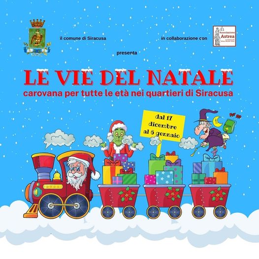 Le Vie del Natale dalle ore 10.00 e nei giorni indicati, spettacoli itineranti nei quartieri di Siracusa con Babbo Natale, i suoi amici e gli scherzi del Grinch, artisti di strada, trenino lillipuziano, bolle di sapone giganti, zampognaro, banda musicale, sbandieratori.