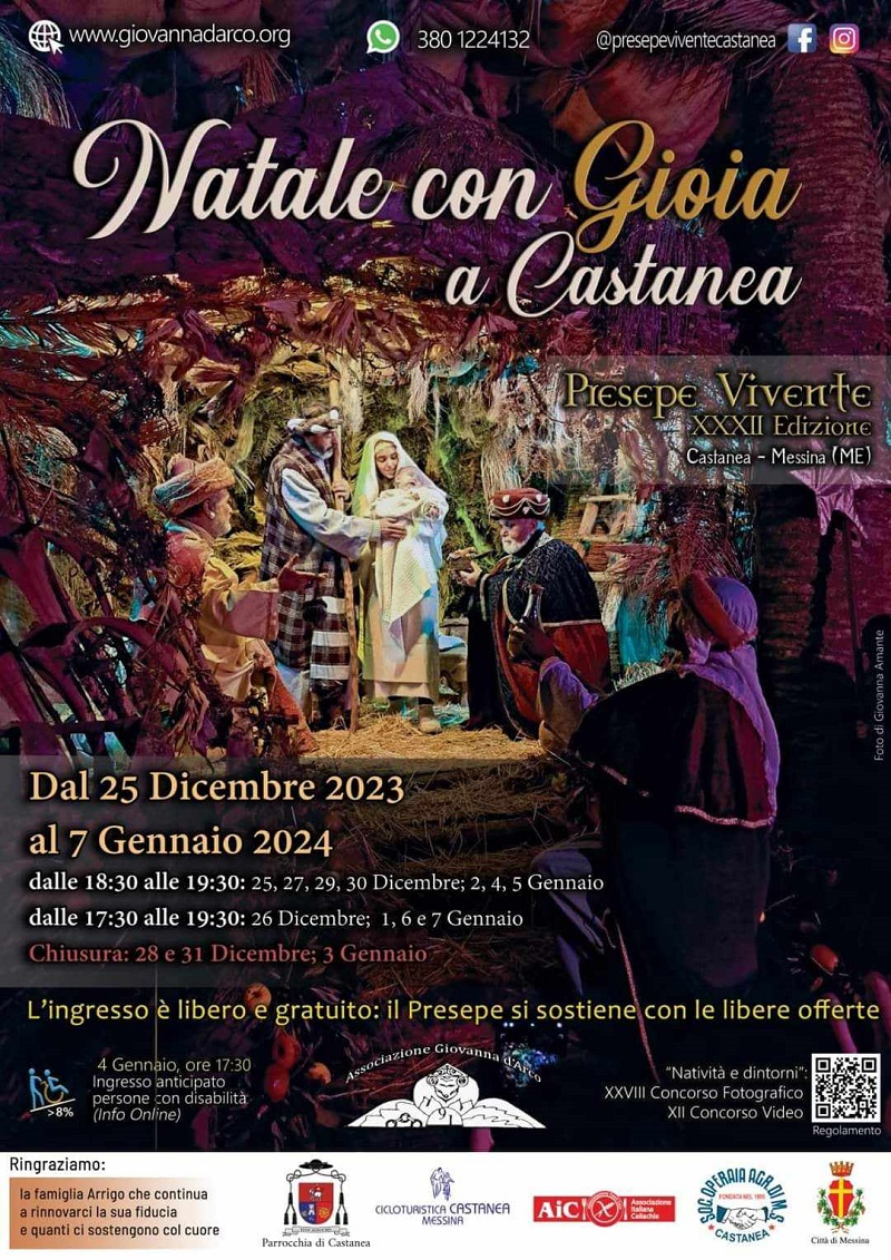 Dal 1989, l’Associazione turistico culturale “Giovanna d’Arco”, a Castanea delle Furie, allestisce un Villaggio bethlemmiano vivente nel lussureggiante parco della ex Villa Costarelli. Oltre 350 figuranti popolano questo Presepe e tutta la comunità dell’antico Casale messinese partecipa a questa grande rappresentazione da teatro edificante medievale. Nessuno recita o mima pateticamente gesti, manualità, saperi antichi di mestieri artigianali, contadini e pastorali. Nessuna finzione, insomma, perché gli ambienti, i tipi umani, gli strumenti di lavoro, le suppellettili, gli arredi e le botteghe che compongono tutti i quadri viventi di questa rappresentazione en plein air, attingono proprio dal vissuto degli abitanti di Castanea, dai loro segni autentici di una civiltà e di una cultura agro pastorale che un tempo scandiva i giorni del villaggio.