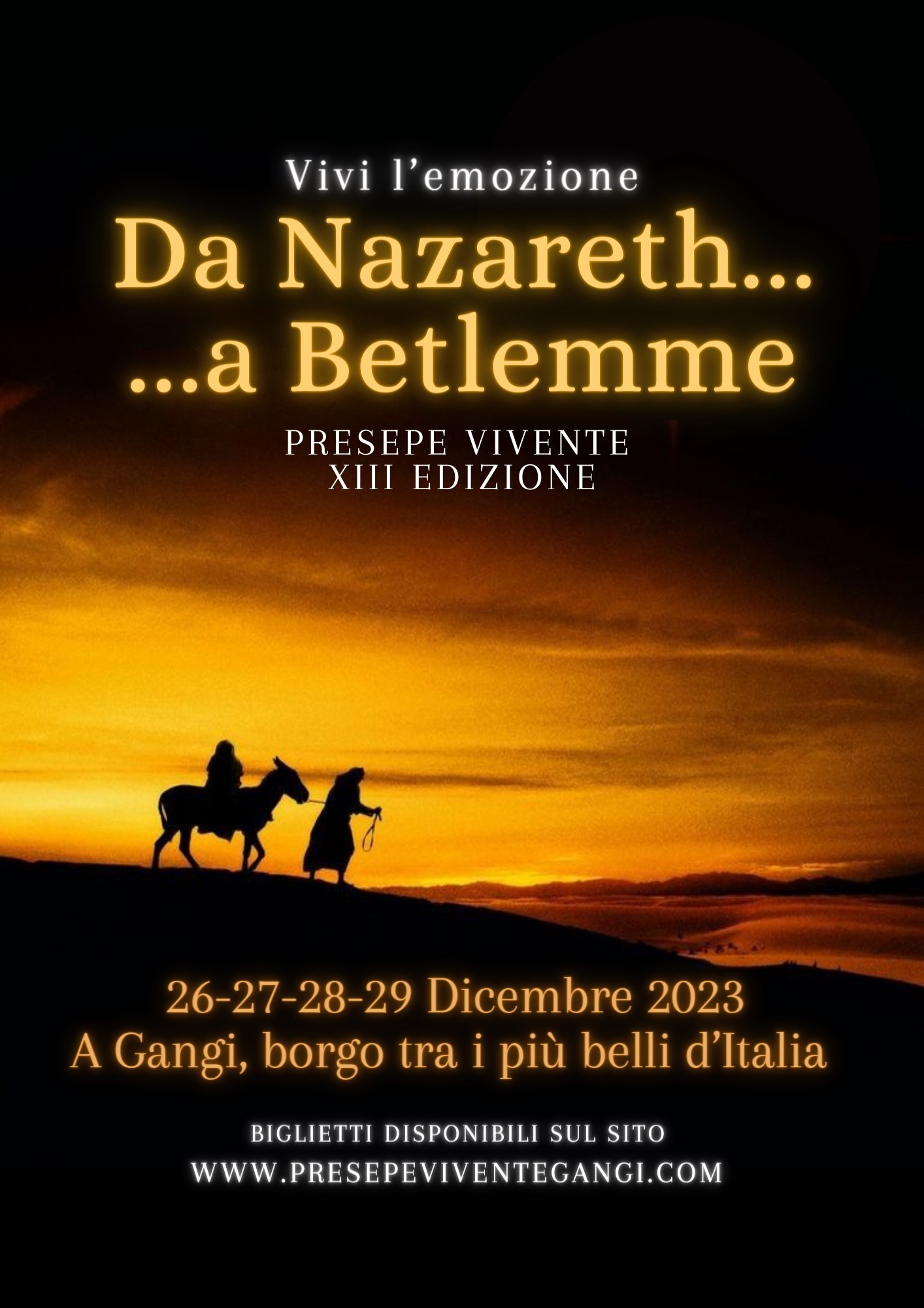 Da Nazareth a Betlemme, Il silenzio… una voce… un viaggio… la vita è uno dei più suggestivi Presepi viventi che ha come palcoscenico il centro storico di Gangi, il Borgo più Bello d’Italia 2014, fatto di scalinate, torri e strette vie che si trasformano per l’occasione in un tipico ambiente palestinese.