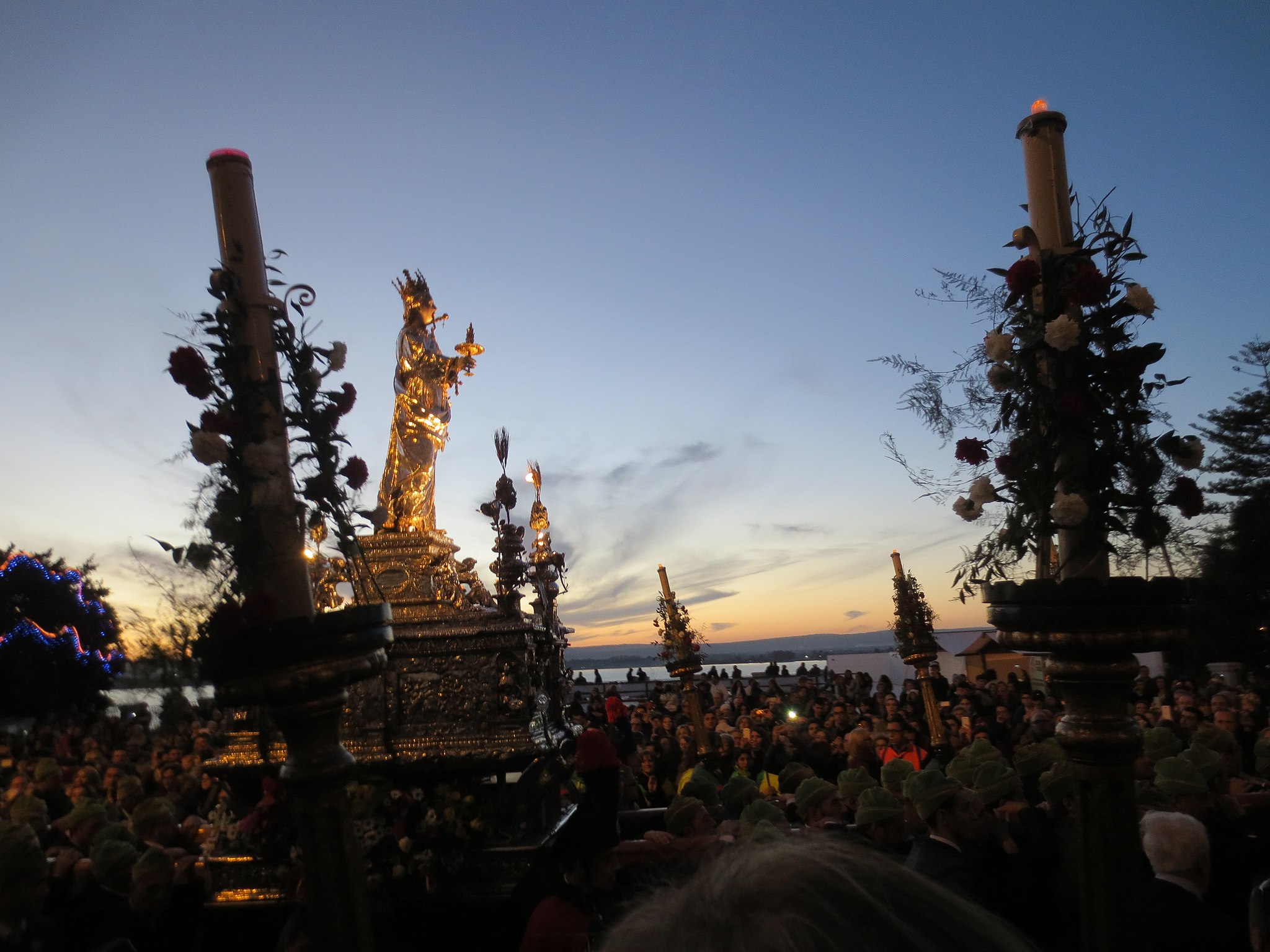 All’arrivo al Ponte Umbertino la città saluta con fuochi pirotecnici la Santa prima che riprenda il suo percorso verso la Cattedrale, dove farà il suo ingresso ritornando nella Sua Cappella.