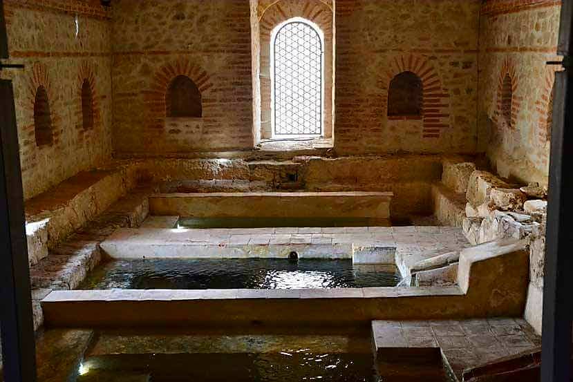 L’ intérieur du bâtiment est divisé en deux parties : un mur avec trois jolis arcs, dont le centrale est ogivale, et un espace plus grand, couvert par une voûte en arc abaissé qui abrite trois bassins relié entre eux.