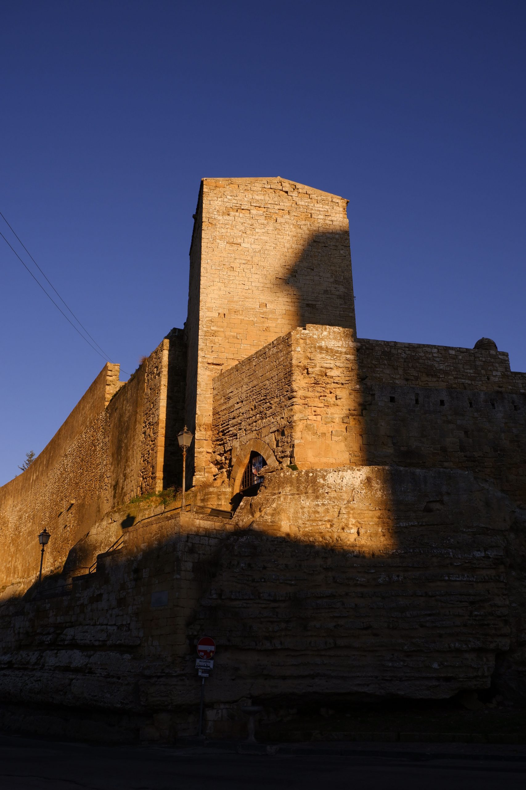 Continuons encore plus en allant légèrement vers l’est pour arriver dans le ‘’nombril de la Sicile’’ qui avec ses 950 m au-dessus du niveau de la mer est le chef-lieu le plus haut d’Italie : Enna (link Enna). En vous approchant de la ville,  vous pourrez même de loin, apercevoir le Château de Lombardie, qui se trouve au point le plus élevé de la ville. Au Moyen Âge, le château était l’un des remparts les plus importants de l’île et il doit son nom à une garnison de soldats « lombards » (c’est-à-dire, génériquement, « du nord ») qui avaient été postés pour défendre la forteresse pendant la domination normande. Le château doit sa conformation actuelle à la structure souabe, mais ses racines remontent aussi loin que la forteresse que les Sicans ont construite il y a plus de deux millénaires. Avec ses 26 000 mètres carrés de superficie, c’est l’un des plus grands châteaux médiévaux d’Italie et c’est ici que Frédéric II de Souabe a convoqué le premier Parlement sicilien. À l’intérieur, l’église privée et la résidence de l’empereur Frédéric III d’Aragon peuvent encore être vues et visitées. Près du château, sur l’éperon oriental d’Enna, se dresse la Rocca di Cerere (lien vers le Géoparc Rocca di Cerere), sur laquelle s’élevait le temple que les Sicani avaient érigé pour vénérer la déesse des moissons. Le plongeon dans le passé est ici vertigineux, comme le sont les hauteurs. Mais ce n’est pas encore fini… Il existe une autre fortification qui, avec le château, représente le plus grand symbole architectural de la ville : la Tour de Frédéric II. Communément attribuée au célèbre empereur, ses origines continuent de susciter débats et mystères. En effet, certains pensent qu’il s’agissait d’un observatoire astronomique beaucoup plus ancien, construit par les Sicules au centre exact de la Sicile et dans un alignement particulier avec les corps célestes. Vous pouvez donc être au centre de l’île et en contact avec le cosmos en même temps !