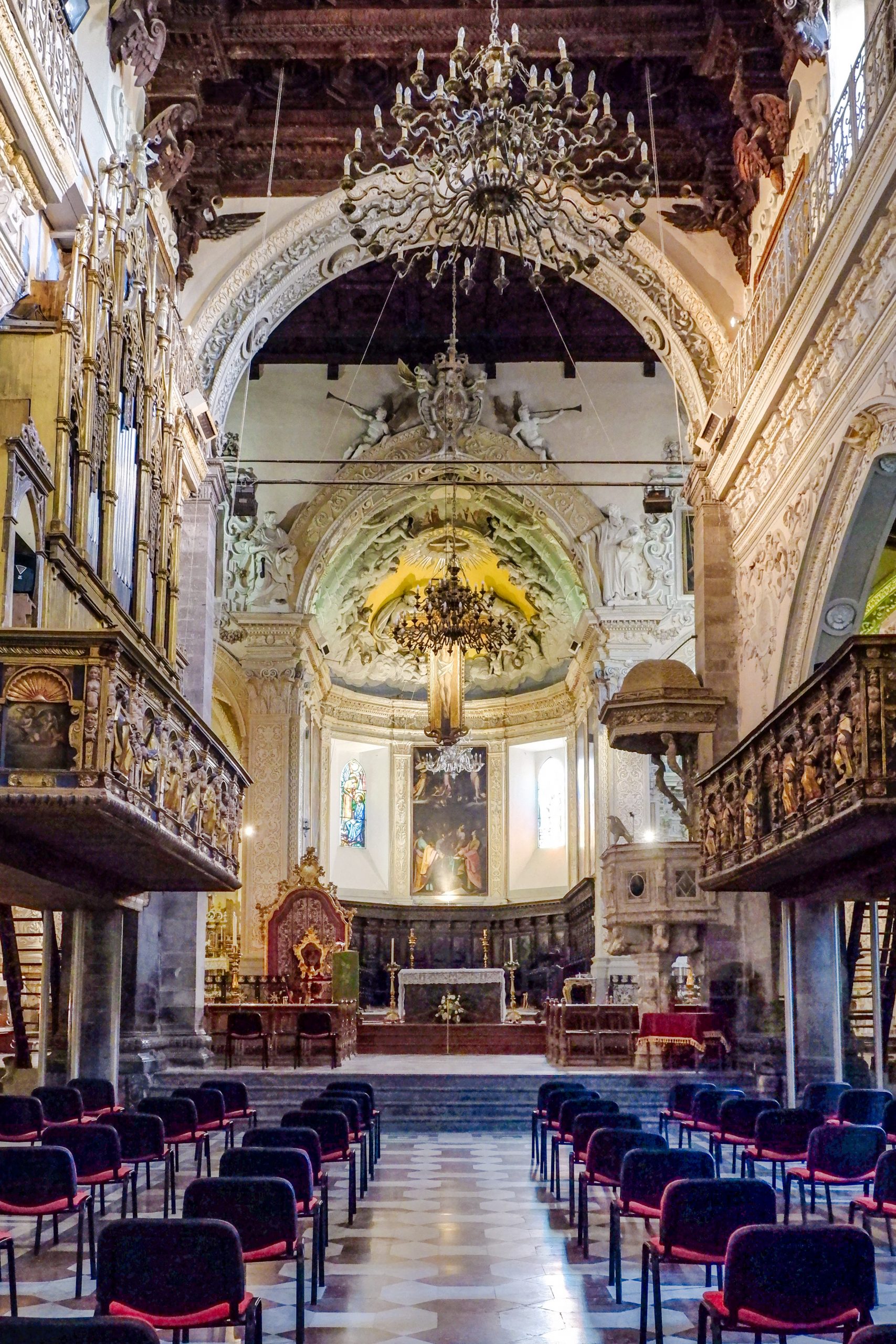 L’abside sinistra, con le antiche forme gotiche e le volte costolonate, è dedicata al SS. Sacramento; quella a destra, riccamente rivestita da marmi policromi su disegno barocco di Andrea Amato, è dedicato alla Madonna della Visitazione.