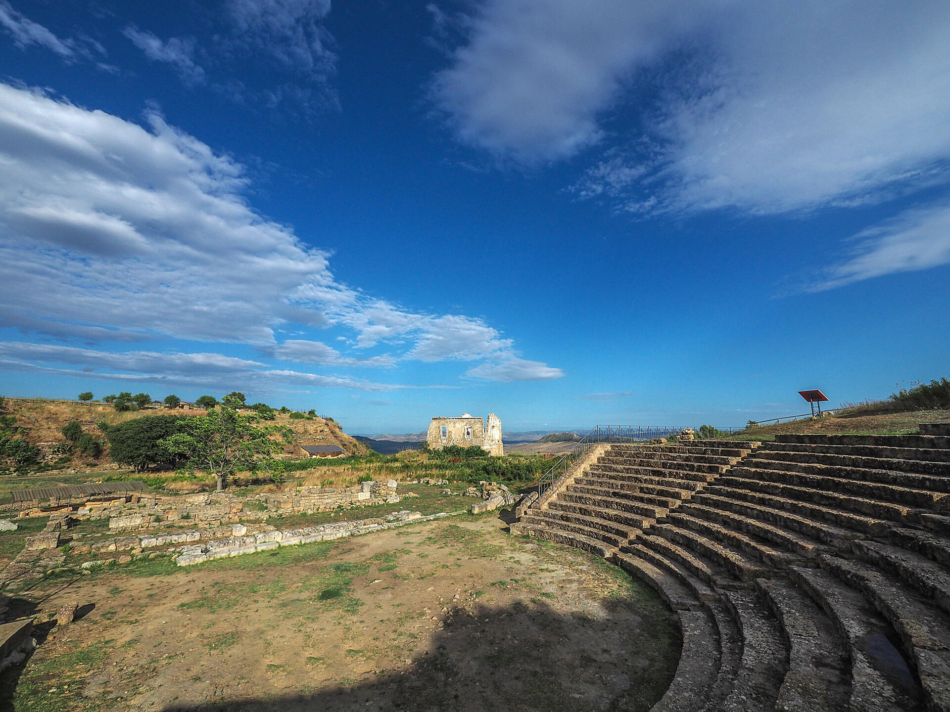 Passiamo poi al Parco archeologico di Morgantina, ad Aidone (EN). Morgantina è un caso raro in Sicilia di città abbandonata (la vita finisce nel I sec. d. C.) che non ha subito tutte quelle trasformazioni dovute alle sovrapposizioni storiche. La città è ancora in corso di scavo, ma è visitabile l’area pubblica con monumenti di età ellenistica, in particolare lo splendido teatro, una serie di case più o meno ricche e importanti edifici termali, ben precedenti a quelli noti nel mondo romano. Per una conoscenza più completa della storia di questa misteriosa località abbandonata, occorre fare tappa al Museo archeologico di Aidone: qui, al percorso informativo sul sito, negli anni si sono aggiunti diversi capolavori rientrati da importanti musei internazionali: come la coppia di Acroliti di epoca arcaica (teste, mani, piedi in marmo di un gruppo di Demetra e Kre); e l’imponente statua di Dea della fine del V sec. a. C.; il tesoro di argenti ellenistici; la testa di Ade in terracotta policroma del IV sec. a.C.