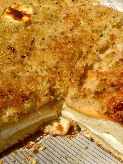 Quando l’impasto sarà raddoppiato di volume, lo dividiamo in due parti uguali e le poniamo nelle teglie ben oliate. Versare un po’ d’olio sull’impasto e, con la punta delle dita, delicatamente, ricaviamo due dischi dallo spessore di due/tre centimetri. A questo punto, riscaldiamo il forno a 240° e procediamo con i condimenti: spezzettiamo le sarde salate e le inseriamo nell’impasto; ricopriamo la superficie con il primosale affettato; adagiamo sul primosale fette di ricotta e le spalmiamo piano piano; cospargiamo infine sulla ricotta la cipolla messa da parte in precedenza e ricopriamo con la mollica di pane l’intera superficie.