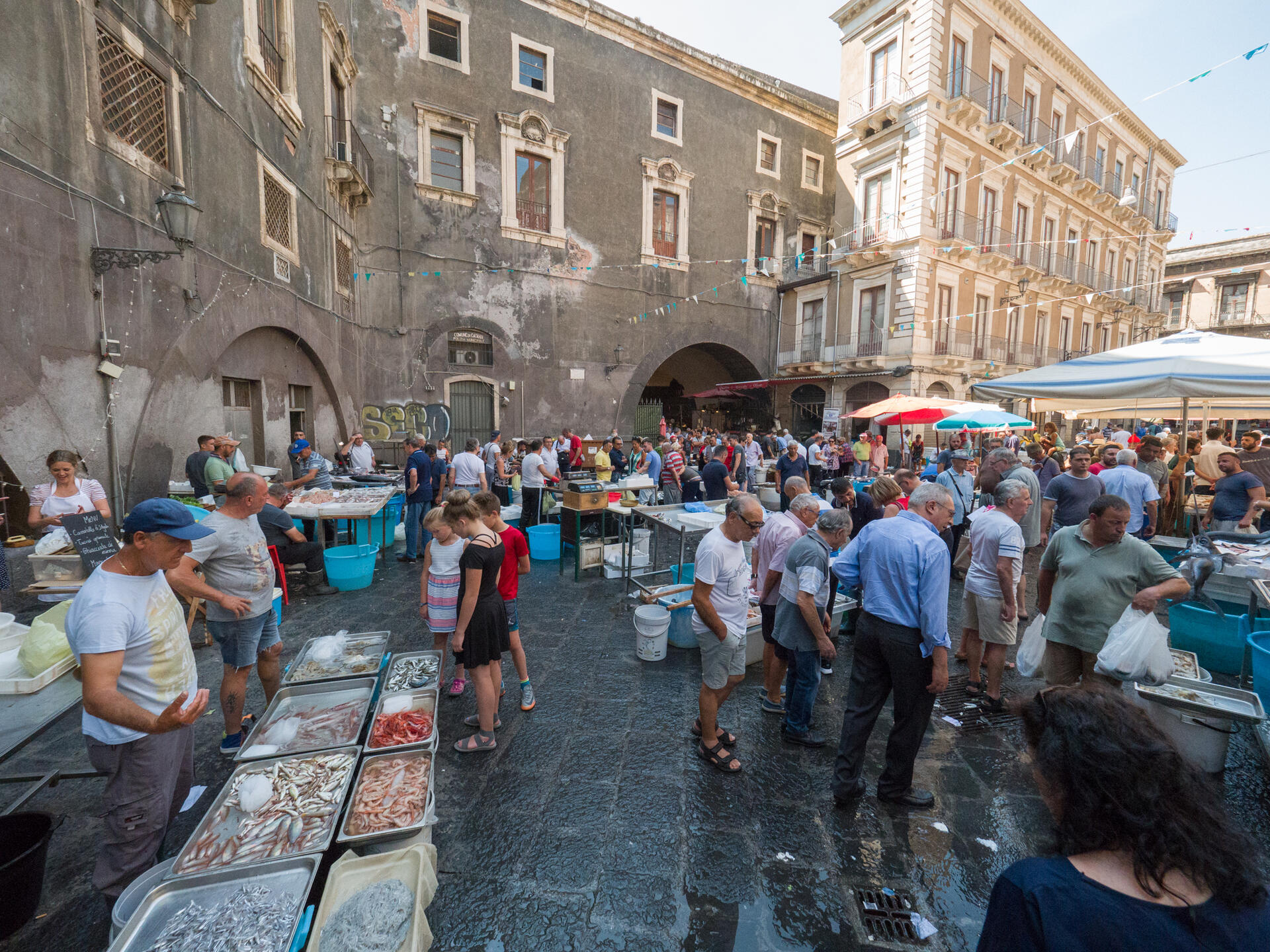 Vi troneggiano interi pesci spada, cernie scure, orate e saraghi, cozze e vongole, polpi ed altri crostacei. Abbonda anche il pesce azzurro, tra sardine, sgombri, lunghi pesci spatola e caponi color argento. E gamberi di tutti i tipi, da quelli grandi e rossi di Mazara del Vallo a quelli più piccoli, spesso già puliti e sgusciati. Nel centro storico di Caltanissetta, scopriamo il fascino senza tempo di via Consultore Benintende: colorata e profumata questa via ospita, dalla fine del XVIII secolo, lo storico Mercato Strata ‘a foglia.