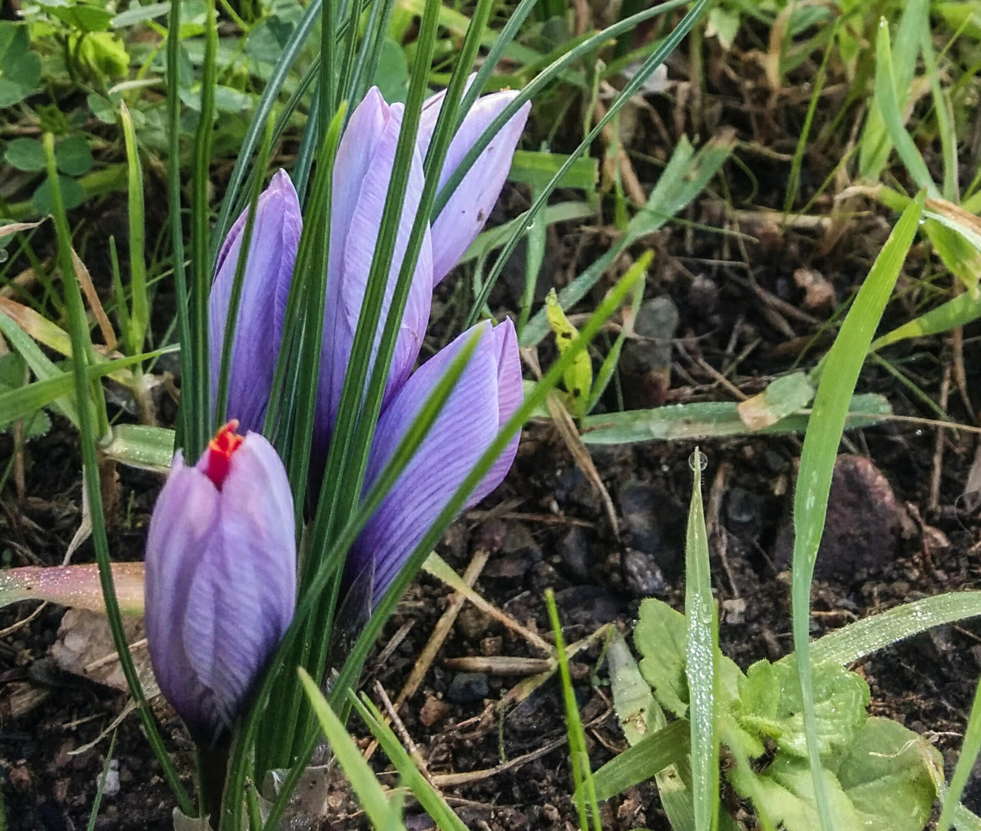 Arrivi sul campo con gli occhi ancora impastati di sonno e sogni. Al mattino presto i fiori di zafferano sono ancora chiusi, così i petali proteggono gli stimmi da calore e intemperie. Fa freddo, specie se il cielo è ovattato di grigio e residui di buio, e le nubi coprono il sole che si sta svegliando. Se ha piovuto o la brina è ancora appesa ai fili d’erba, ti pizzicheranno un po’ le dita. Più ti avvicini a loro più ne distingui quel viola che non assomiglia ai ciclamini, e neppure ai nontiscordardime. È qualcosa di prezioso e di raro. Sembra stia aspettando silenziosamente di essere strappato delicatamente via dalla terra. Ogni fiore è come un piccolo scrigno: dentro si cela il tesoro, l’oro rosso come lava. Con l’indice e il pollice afferri il gambo del primo fiore e zac! Poi procedi senza fretta ma con passo sicuro. È un’operazione che richiede la massima attenzione, ma una volta imparato ti sembra quasi di compiere un rituale, di esibirti sul campo come fossi su di un palcoscenico circondato da alberi, montagne, aria pura. Così danzi e con i fiori ci parli, o almeno, non stupirti se dovesse venirti naturale farlo.